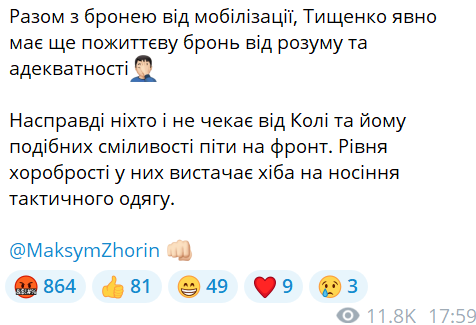 "Разом з бронею від мобілізації, Тищенко явно має ще пожиттєву бронь від розуму та адекватності", — написав військовий.